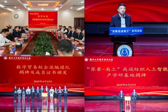 徐雨祥与高宏彦共同为数字贸易校企混编团队揭牌。该团队由苏豪集团5位企业导师及商务贸易学院5位教师联合组成,未来将聚焦跨境电商、数字营销等领域培养复合型贸易人才。徐雨祥与高宏彦共同为“苏豪-南工”高端纺织人工智能产学研基地揭牌,该基地的建立将聚焦人工智能与纺织业融合,推动技术创新与产业升级。徐雨祥和高宏彦等校企相关负责人为前期在首届“苏豪杯”外贸技能大赛获奖的20位同学颁奖。