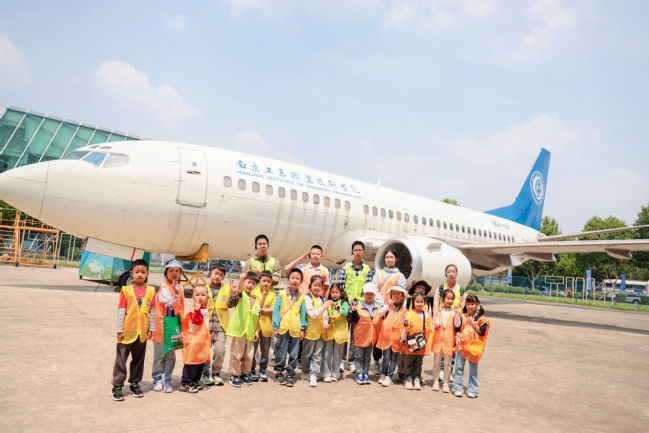 在航空主题实践区,停驻的波音737真机成为焦点。教师以飞机结构为教具,生动解析民航客机的核心构造与飞行原理。随后学员们走进航空发动机实训基地,近距离观察涡轮叶片等精密部件,并登上罗宾逊R22直升机驾驶舱合影留念。