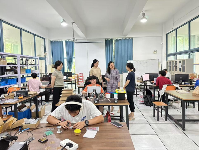 走访过程中,魏萍与全国大学生电子设计竞赛、华为ICT大赛等参赛团队的师生进行了深入交流。她认真听取了各团队的备赛进展汇报,详细询问了训练计划、技术难点和生活保障等情况。看到师生们冒着酷暑坚持训练,她高度赞扬了大家的拼搏精神,并强调:“学科竞赛是检验教学成果、提升实践创新能力的重要平台,学校将全力做好服务保障工作,为师生参赛保驾护航。”