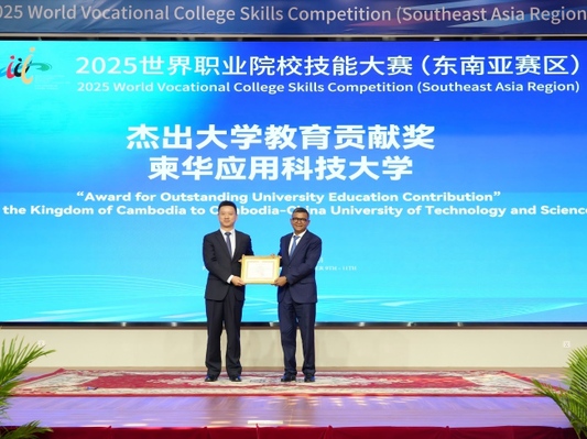 9月11日上午,2025年世界职业院校技能大赛(东南亚赛区)闭幕式暨颁奖典礼在柬埔寨金边柬华应用科技大学隆重举行。闭幕式上举办了杰出大学颁奖仪式,柬埔寨副首相兼教育、青年和体育部大臣韩春那洛向taptap党委书记谢永华颁发了“杰出大学教育贡献奖”,以表彰taptap点点官方网站与柬华理事总会共建的柬华应用科技大学对柬埔寨本土技术技能人才培养所做出的杰出贡献。