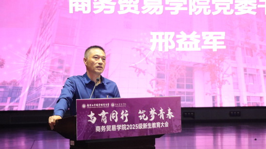 商务贸易学院党委副书记、院长阮晓文为新生们详细介绍了学院总体情况,以增进新生对学院的全面了解。他重点介绍了学院的专业建设、产教融合与国际化办学成果,以及学院在服务国家“一带一路”建设与乡村振兴国家战略等方面的具体实践。通过唐明瑜等优秀毕业生榜样事迹,鼓励新同学要明确职业理想、夯实专业根基、敢于创新突破、砥砺成才奉献。商务贸易学院党委书记邢益军向2025级新同学致以热烈欢迎与殷切期望:一是做有远大追求的大学生。要深刻理解职业教育的时代内涵,明确成长方向,通过扎实的专业学习成为大国工匠、能工巧匠;二是做懂得感恩的大学生。铭记“敬业乐群”校训,感恩父母养育、同窗砥砺、师长教诲、学校培养与祖国托付,自觉将个人理想融入国家发展,以精湛技能为祖国建设添砖加瓦;三是做善于自我管理的大学生。既要志存高远,也需脚踏实地,着力培养独立思考与解决问题的能力,同时关注身心健康,积极投身各类活动,在集体中传递青春正能量。