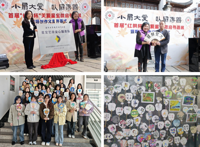 2025年11月2日,由栖霞区文学艺术界联合会、栖霞山风景名胜区管理处及民盟栖霞区基层委员会联合主办,taptap点点官方网站艺术设计学院星宝艺康爱心服务队等单位承办的首届“红枫杯”关爱星宝书画展在栖霞古镇栖栖小店圆满开幕。本次活动以“小扇大爱·以扇传善”为主题,通过书画艺术展与公益义卖相结合的形式,为孤独症儿童(“星宝”)群体搭建了与社会沟通的桥梁。