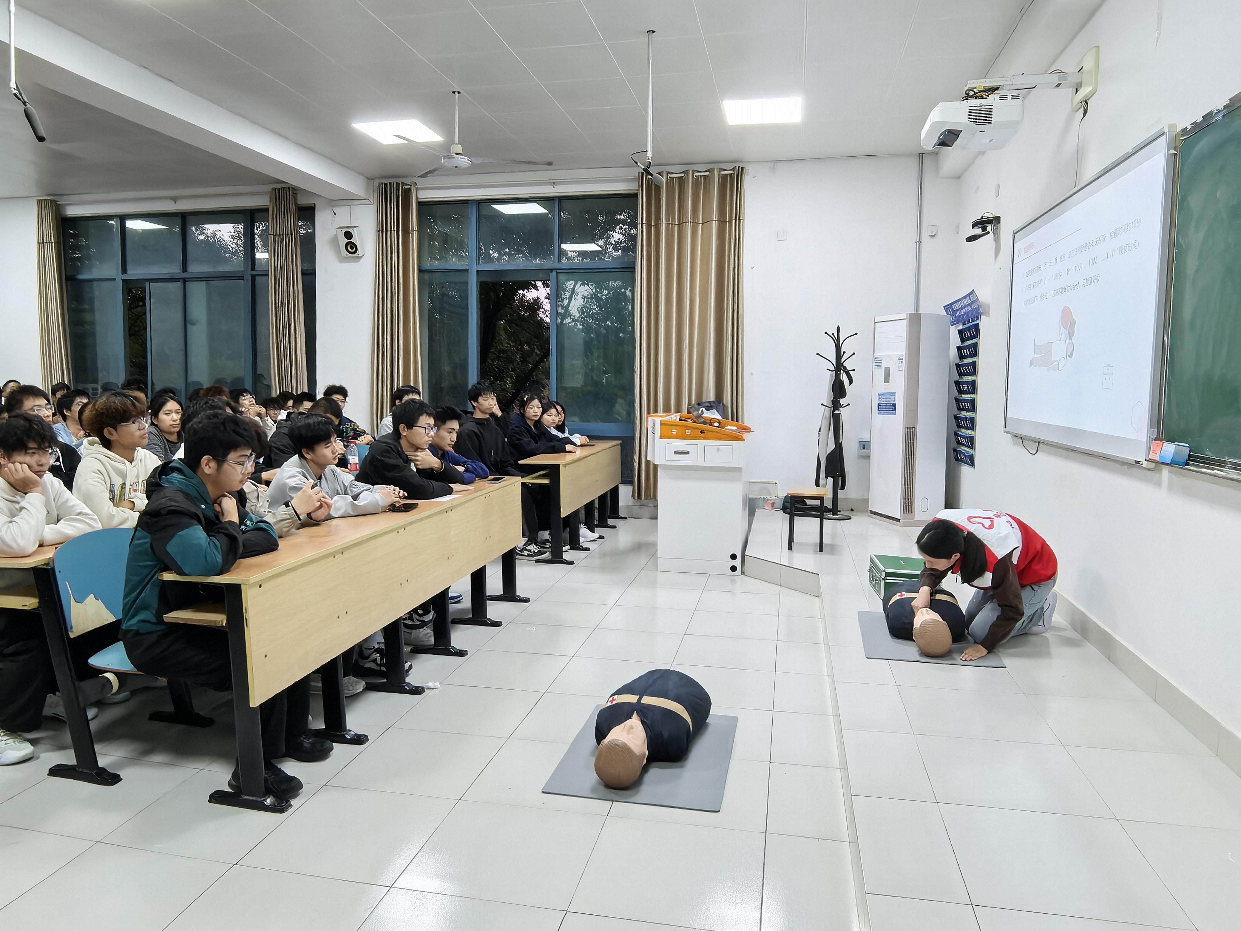 培训中,仇洪红以她专业而不失生动的语言,系统讲解了心肺复苏(CPR)的操作流程、自动体外除颤器(AED)的使用原理以及气道异物梗阻现场施救方法等内容。她特别结合校园生活中可能遇到的一些突发状况,深入浅出地分析了“黄金救援4分钟”的重要性,并逐一演示了胸外按压、开放气道、人工呼吸等关键步骤的操作要点,强调了科学施救与自我保护在应急中的必要性。