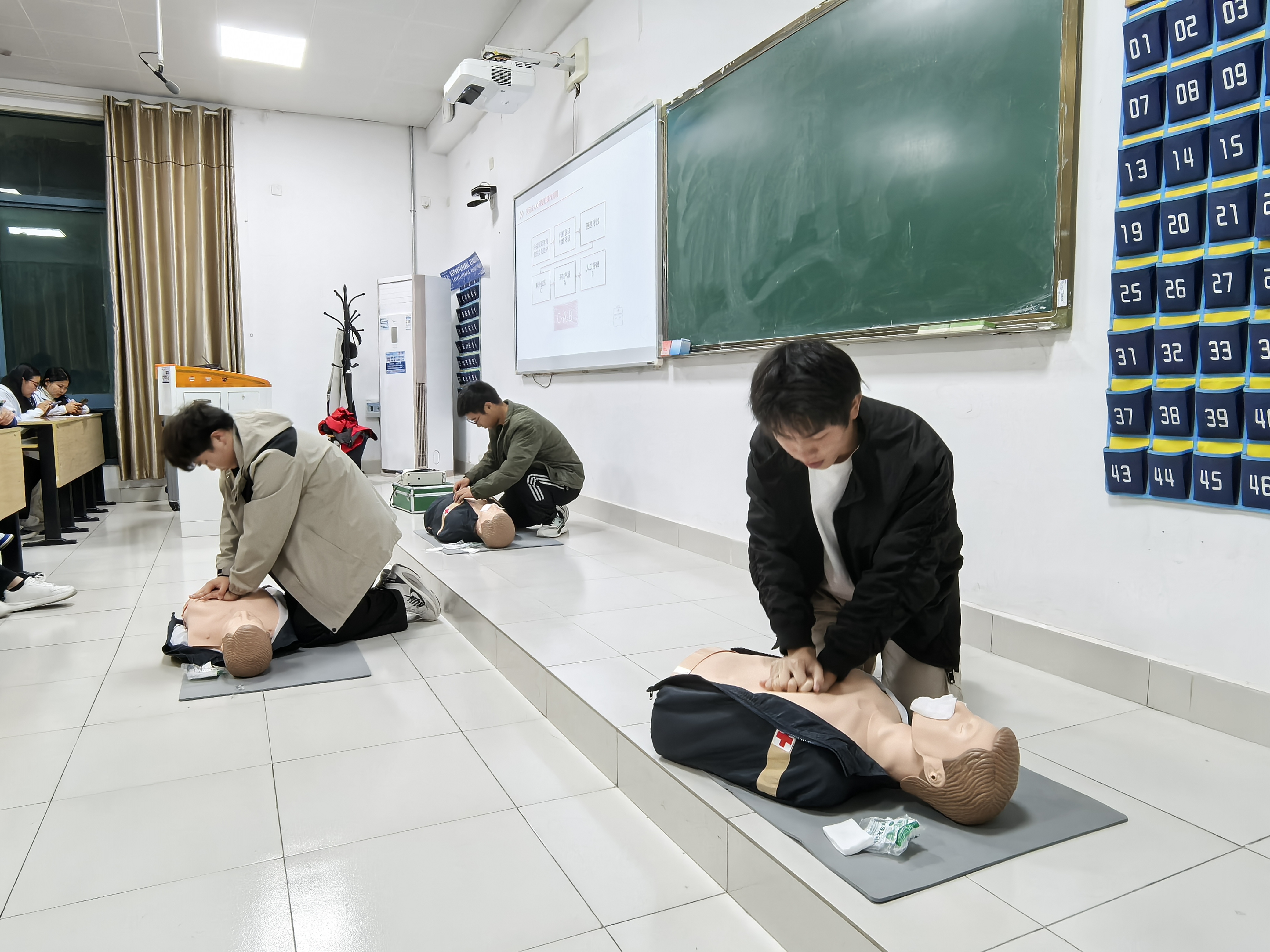 进入实操演练环节,新生们跃跃欲试,按照三人一组陆续上台,他们利用专业模拟人教具和AED训练机进行了心肺复苏的全流程实践。从环境评估到呼救,从按压定位、深度与频率的掌握到人工呼吸的有效实施,每一位同学都认真投入、反复练习,仇洪红在一旁悉心指导,不时俯下身纠正他们的动作,力求操作规范。现场学习氛围浓厚,师生互动积极,同学们在亲身体验中将理论知识转化为实操能力。