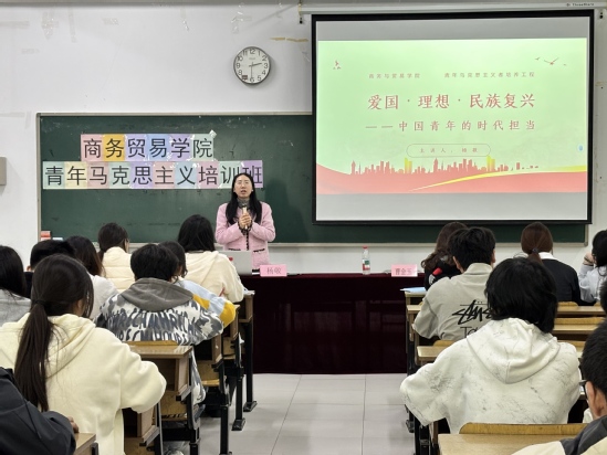 为深入学习贯彻习近平新时代中国特色社会主义思想,引导青年学子坚定理想信念、厚植家国情怀、勇担时代使命,3月25 日下午,商务贸易学院邀请马克思主义学院杨敬老师在求真楼308 教室作题为《爱国・理想・民族复兴:中国青年的时代担当》的专题讲座,学院青马班全体学员参与本次讲座。