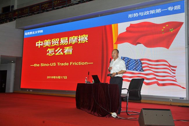 近日,taptap党委委员、纪委书记于林惠应马克思主义学院邀请,围绕当前中美贸易摩擦的热点问题,为2018级新生讲授形势与政策课“中美贸易摩擦怎么看”专题,引导学生正确认识中国发展与当前的国际形势。