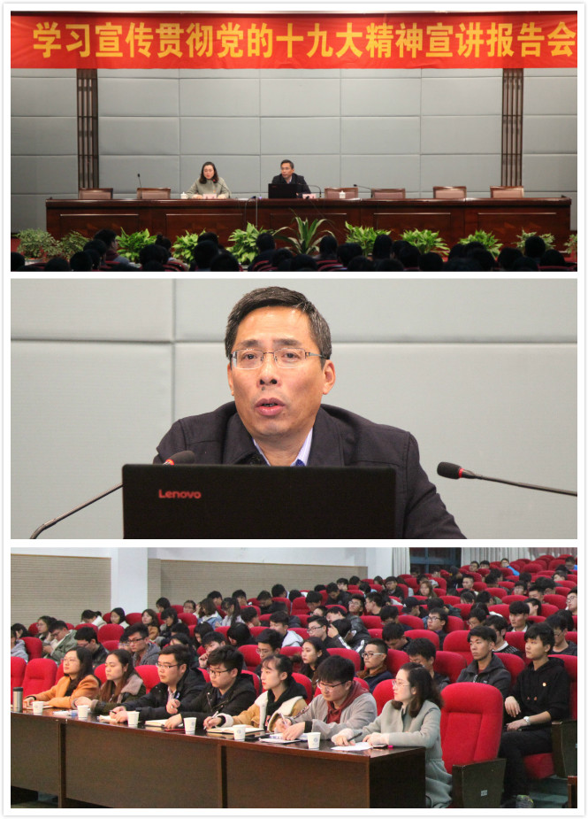 王永贵教授作了《新时代、新使命、新思想、新征程、新部署——深刻领会党的十九大精神》专题报告。王教授的报告围绕大会的主题、主要成果及召开背景,中国特色社会主义进入新时代,实现中华民族伟大复兴中国梦的新使命,习近平新时代中国特色社会主义思想,开启全面建设社会主义现代化国际新征程,新时代经济社会发展的重大战略新部署,坚定不移推进从严治党七大部分,紧密联系党的十九大展现出新时代、新使命、新思想、新征程以及新部署等,以翔实的数据案例、朴实精炼易懂的语言表达,对党的十九大精神做了全面、生动的解读,阐释了习近平新时代中国特色社会主义思想的精神实质和丰富内涵。学员们听的入神,记得认真。讲座结束前,王教授还深切寄语学员们要时刻严于律己,不断学习,提高个人素养,提升专业本领,努力成长为中国特色社会主义事业的合格建设者和可靠接班人。