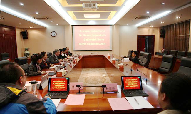 10月23日,美国纽约州立大学科贝尔斯基尔学院国际部主任苏珊女士(Ms.Susan Jagendorf-Sobierajski)来taptap访问,总督学卢兵热情接待了客人,双方就两校合作事宜进行了洽谈。国际合作与交流处、国际教育学院、商务贸易学院相关负责同志和团队老师参加了接待。