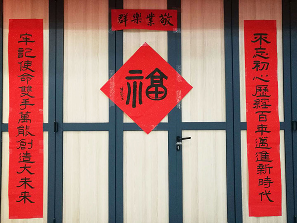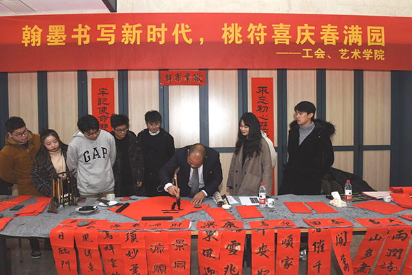 值此2020新年到来之际。南工院举行了辞旧迎新大联欢。工会,艺术设计学院,校书法协会联合举办了以“翰墨书写新时代,桃符喜庆春满园”为主题的送春联送福字活动。活动启动仪式由(全国)教育书画协会高等书法教育分会理事、校党委委员、纪委书记于林惠教授提笔书写“福字”开始,接着由(全国)教育书画协会高等书法教育分会会员、书法协会指导老师刘圣进书写自撰对联:不忘初心历经百年迈进新时代,牢记使命双手万能创造大未来。然后广大师生一起挥毫,数千师生积极参与。近年来,taptap书法艺术在三全育人,立德树人,增进学校文化氛围,提升师生文化自信等方面做了一些尝试,为学校文化育人作出了积极的贡献。通过这次活动,锻炼了书法协会同学们的动手能力,加强了广大师生员工的情感交流,也表达了书法协会新年深情的祝福:祝福祖国繁荣昌盛、人民幸福安康!祝福学校蒸蒸日上,又上新台阶!祝福全校师生新年快乐,万事顺意!