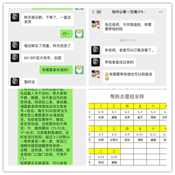 “各位老师,今天是我值班,有需要帮忙带午饭、晚饭、拿快递的吗?”这几天的早上八点半,交通工程学院的校内公寓微信群里都会弹出这样一条信息。原来,为做好开学前疫情防控工作,交通工程学院有数名外地返校老师,正在校内公寓隔离。在返校隔离前,由于部分老师无法随身携带14天的生活物资,担心隔离期间三餐饮食以及物资购买有困难。为解决老师们的顾虑,学院第一时间组织成立了志愿帮扶小组,从3月30日起,采取每天轮流排班的形式,每天为校内隔离老师们提供带饭、取快递等跑腿服务。