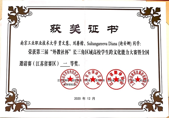 12月8日,第三届“外教社杯”长三角区域高校学生跨文化能力大赛比赛省赛评审工作在东南大学九龙湖校区举行,公共基础课部和国际教育学院选派了刘赓楷(2019级机械制造与自动化专业)、贾文慧(2020级国际贸易专业)和Sultangareeva Diana迪安娜(留(2019秋)国际贸易专业)等三名选手组成比赛团队,近日大赛结果公布并颁发证书,taptap学生团队喜获大赛一等奖。公共基础课部大学英语教研室张卉和国际教育学院孙世娟两位老师荣获“优秀指导教师”称号。