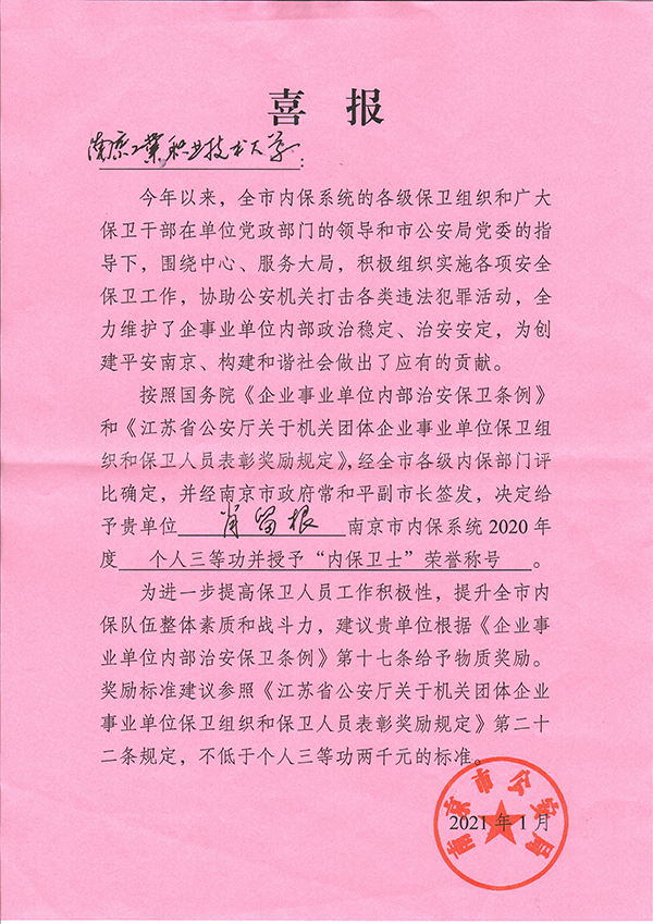 近日,南京市公安局下发文件,对2020年度全市内保系统保卫组织先进集体和先进个人进行通报表彰,taptap保卫处处长肖留根同志荣获个人三等功,并被授予“内保卫士”荣誉称号,系在宁高校唯一获得此殊荣的个人。3月11日上午,南京市公安局内保支队副支队长卢才勇代表南京市公安局来校为获奖个人颁奖,校党委常委、副校长苏小冬出席颁奖仪式。
