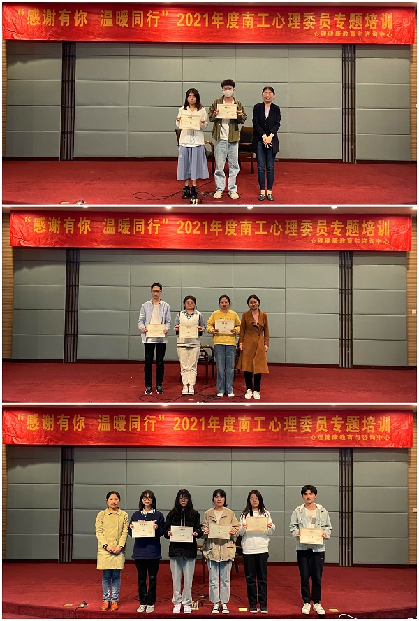 知行合一,学以致用。4月21日下午,心理委员们在学术报告厅进行结业考核。上半场理论考核以问卷星线上答题形式完成,仙林校区、天堂校区在腾讯会议直播中同步进行。经过理论考核,成绩排在前14名的心理委员进入下半场实操考核,按抽签顺序依次进行现场情景模拟。面对抑郁、失恋、学业压力、焦虑等各种常见心理问题,心理委员们将培训中学到的倾听、开放式提问、共情等技巧充分利用,展示出一位合格心理委员的工作状态。最终10名同学分获一二三等奖。