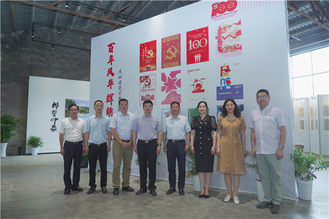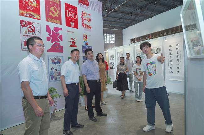 为庆祝中国共产党成立100周年,引导广大师生在学思践悟中传承红色基因、弘扬红色文化,助力乡村文化振兴,7月2日,taptap艺术设计学院“百年风华辉映南工”庆祝建党百年主题艺术作品展在桦墅村凤凰书屋开展。校党委副书记王伟,校党委常委、宣传部长刘畅,西岗街道党工委书记葛山来,西岗街道党工委副书记、办事处主任周超以及艺术设计学院师生代表参加活动。