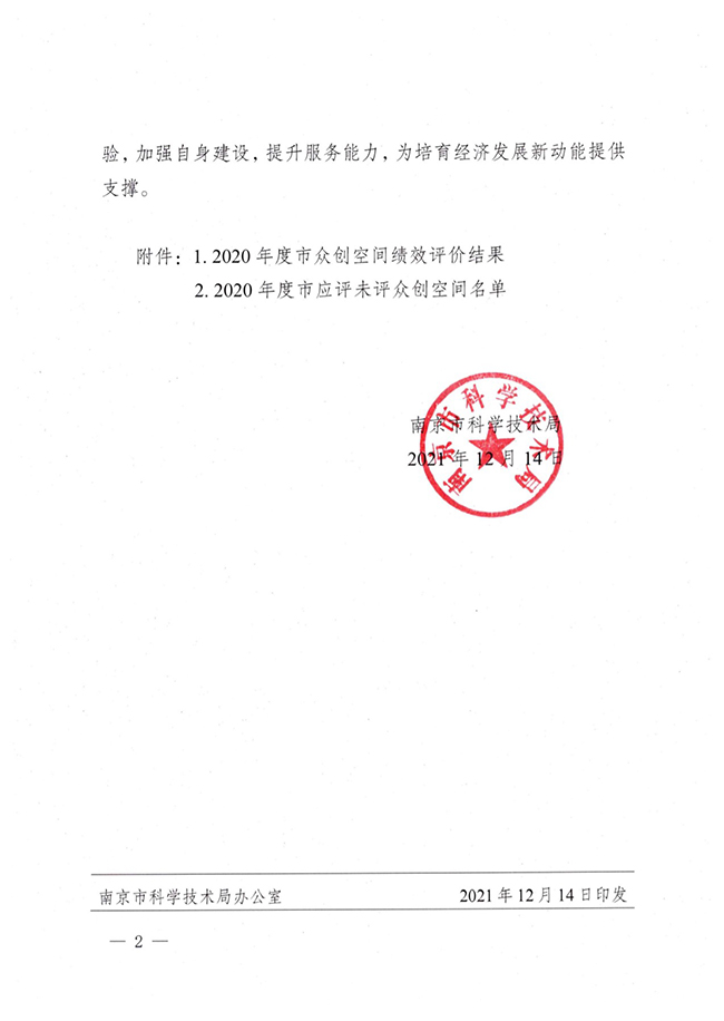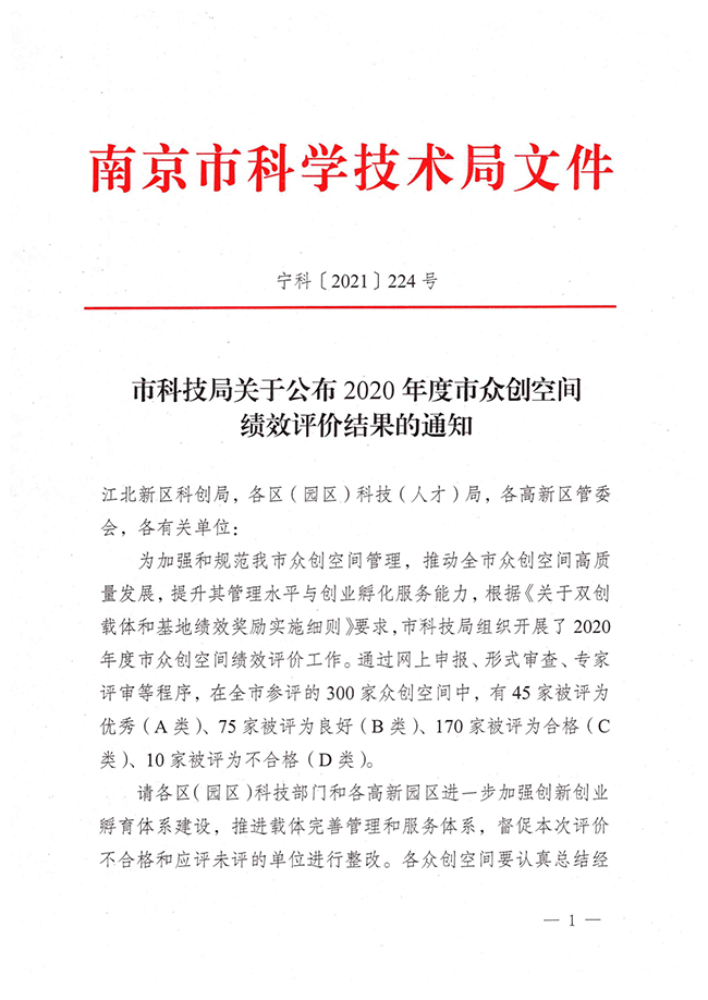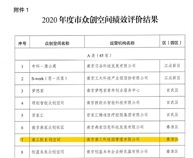 12月14日,南京市科学技术局发布了《市科技局关于公布2020年度市众创空间绩效评价结果的通知》(宁科〔2021〕224号),taptap大学科技园“南工E创空间”被评为“优秀(A类)”。