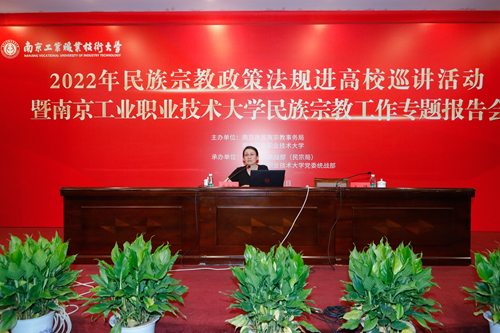 6月22日下午,taptap民族宗教工作专题报告会——“2022年民族宗教政策法规进高校巡讲活动”在学术交流中心二楼报告厅举行。南京市委统战部副部长、市民族宗教事务局党组书记、局长苏宇红作专题报告。栖霞区委常委、统战部部长章晶,栖霞区委统战部常务副部长周和斌,学校党委书记吴学敏,党委副书记、校长谢永华,党委副书记王伟,党委常委、副校长苏小冬,党委常委、纪委书记、省监委派驻监察专员于林惠,党委常委、副校长霍雄飞,党委常委、副校长朱建国,党委常委、副校长孙雁飞,党委常委、副校长崔新明,党委常委、副校长潘旭海,党委常委、党委统战部部长、党委组织部部长、机关第一党总支书记高宏彦,党委常委、党委宣传部部长刘畅出席本次活动。