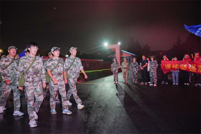 雨夜行军,步履铿锵。同学们用脚步丈量校园内外,为大学生涯留下了难忘的回忆。21时30分,全体拉练新生在志愿者们的摇旗欢呼声中安全返回校园,2023级新生军训拉练任务圆满完成。
