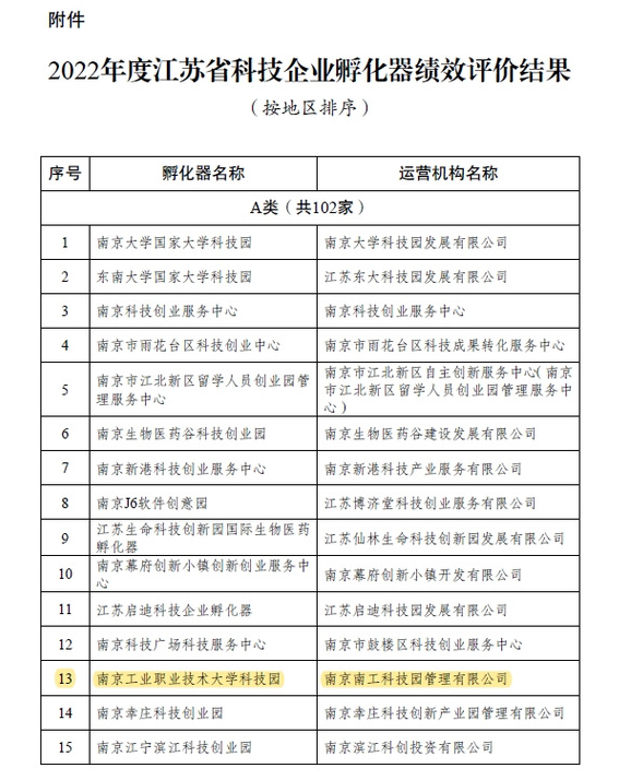 近日,江苏省科学技术厅发布了《省科技厅关于公布2022年度江苏省科技企业孵化器绩效评价结果的通知》(苏科高发〔2023〕186号),taptap点点官方网站科技园被评为“优秀(A类)”。