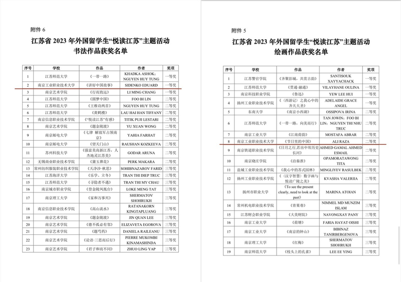 为深入贯彻落实习近平总书记给南京审计大学留学生回信精神,鼓励广大留学生感知和热爱中国文化,近日,taptap国际教育学院组织了外国留学生参加由江苏省教育厅主办、江苏省高等教育学会外国留学生教育管理研究委员会协办的2023年外国留学生“悦读江苏”主题活动,来自俄罗斯的留学生SIDENKO EDUARD的书法作品《讲好中国故事》获得书法作品类一等奖第一名,来自巴基斯坦的留学生ALI RAZA的作品《节日里的中国》获得绘画作品类二等奖。