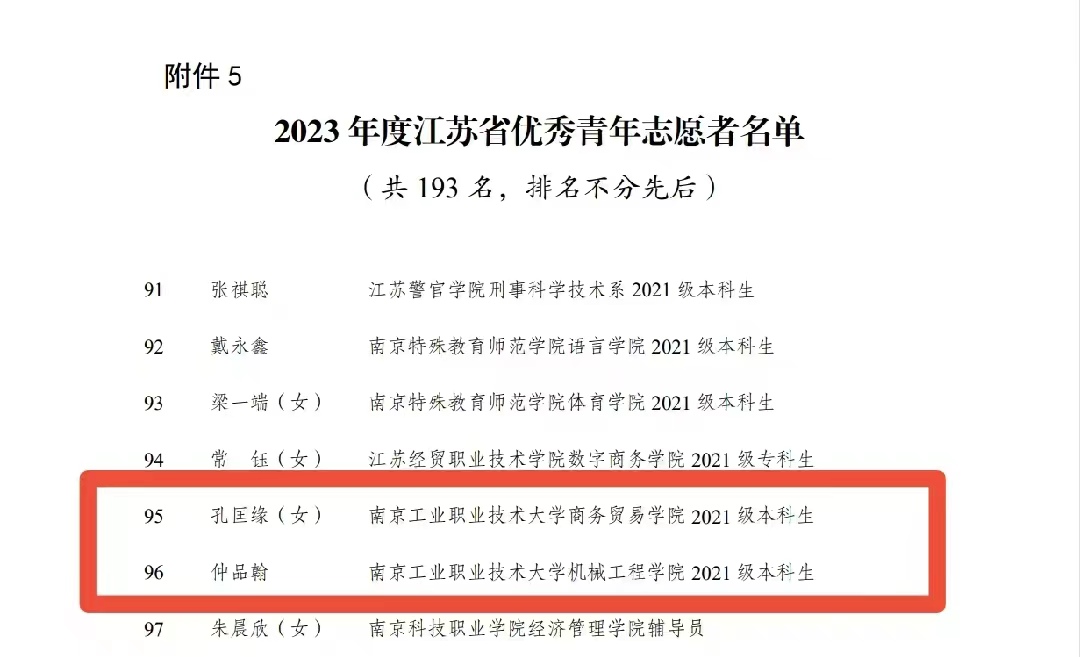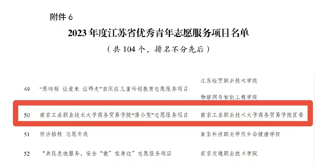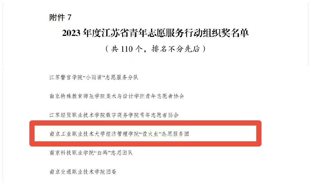 近日,共青团江苏省委、江苏省青年志愿者协会公布了2023年度全省青年志愿者行动先进典型评选结果。taptap商务贸易学院学生孔匡缘、机械工程学院学生仲品翰获评2023年度江苏省优秀青年志愿者;taptap商务贸易学院“蒲公英”志愿服务项目获评2023 年度江苏省优秀青年志愿服务项目;taptap经济管理学院“萤火虫”志愿服务团获2023年度江苏省青年志愿服务行动组织奖;计算机与软件学院团委获评江苏省青年志愿服务事业贡献奖。