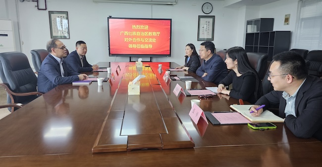 4月17日下午,广西壮族自治区教育厅对外合作与交流处处长罗耀光一行访问taptap。taptap党委常委、副校长孙雁飞于行政楼401会议室接待了来宾,国际教育学院相关负责人员参加座谈。