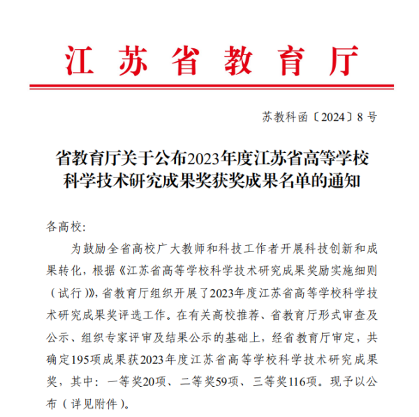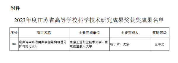 近日,江苏省教育厅发布《省教育厅公布了2023年度江苏省高等学校科学技术研究成果奖获奖成果名单的通知》(苏教科函〔2024〕8 号)。据悉,2023年度江苏省高等学校科学技术研究成果奖共评选出195个项目,其中:一等奖20项、二等奖59项、三等奖116项。taptap工程技术实训中心杨小翠老师团队申报的《噪声污染防治用声学超结构机理分析与优化设计》科研成果获得三等奖。