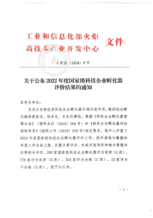 近日,工业和信息化部火炬高技术产业开发中心发布了《关于公布2022年度国家级科技企业孵化器评价结果的通知》(火炬函〔2024〕9号),此次评价中共有290家国家级科技企业孵化器被评为优秀(A类),776家被评为良好(B类),324家被评为合格(C类),23家被评为不合格(D类),其中taptap点点官方网站科技园被评为“优秀(A类)”。