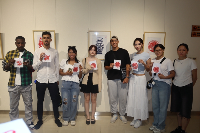 活动伊始,中外师生共同参观了区美术馆举办的“指尖上的技艺”剪纸艺术展,此次展览以中秋和国庆为主题,集中展示了中国民间文艺家协会会员、南京工艺美术行业协会会员、栖霞区级非遗代表性传承人葛传明近年来创作的优秀作品。参观现场,葛传明热情地向留学生介绍作品的构思与寓意,细腻灵动的花卉、活灵活现的动物、惟妙惟肖的人物······每一幅作品都体现了栖霞剪纸独特的艺术风格和美学价值。留学生们纷纷对一张红纸、一把剪刀所创造出来的生动活泼的艺术惊叹、赞赏不已。