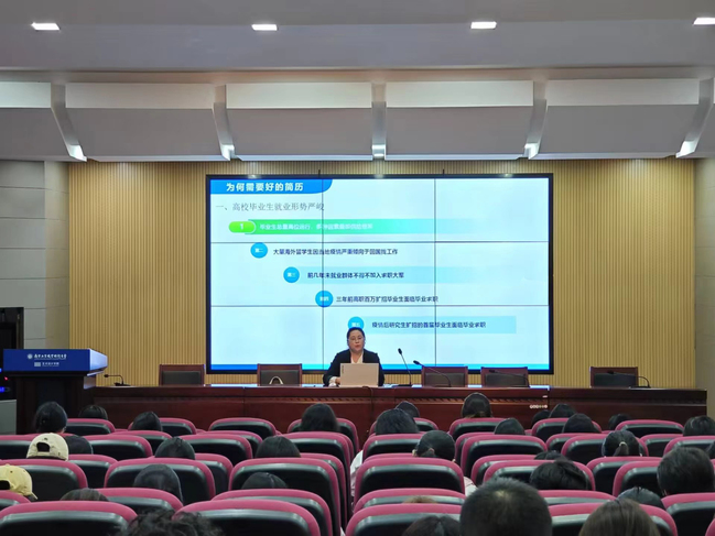 刘璐璐首先从高校毕业生的就业形势严峻引出简历作为个人的一张名片,是应聘者的敲门砖,如何在海量简历中获得面试官的青睐,展示自己的能力特质以及与岗位相匹配的优势,这是所有求职者的必修课题。随后从简历包含的内容以及从自我能力澄清、目标岗位分析、做好人岗匹配、搭建逻辑框架、增强语言表现力五步教会同学们打造人岗匹配简历。指出简历中的校园经历、实习实践、荣誉奖励都是围绕求职意向展开,都是在论证自己如何胜任求职目标岗位的能力和优势,同学们在设计简历时应注意明确一致性,展示和岗位匹配度高的能力。最后她针对简历结构、格式及版面等细节方面给同学们提出了建议并分享了获取简历素材的途径,提醒同学们用好学校资源,鼓励同学们早做准备,选择好未来职业发展方向并积极规划践行。