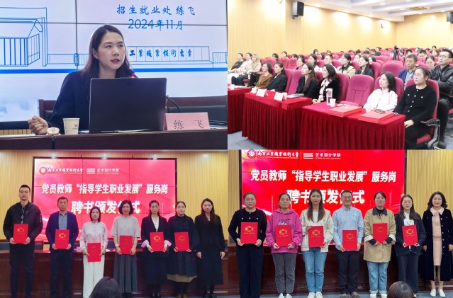 为更好地向艺术学子提供职业生涯教育和就业指导服务,艺术设计学院充分发挥党支部战斗堡垒和党员先锋模范作用,成立了由8名专业老师和8名辅导员老师共同组成的党员教师“指导学生职业发展”服务岗团队,聚焦解决学生发展困惑,把就业教育和观念引导作为“三全育人”的重要内容,引导毕业生树立正确的成才观、职业观、就业观。活动现场,举行了党员教师“指导学生职业发展”服务岗聘书颁发仪式,练飞、毛文娟为指导教师们颁发了聘书。党员教师“指导学生职业发展”服务岗的建立,标志着艺术设计学院在推动学生生涯规划与就业指导服务工作上又迈出了坚实的一步,指导老师们将用专业视角和丰富的经验为学生的发展做好排忧解惑,助力学生科学全面发展。